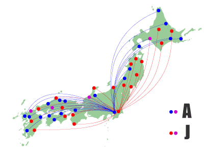 2社の特徴を踏まえて、全国の路線網を描くとこのようなイメージになるわけです。