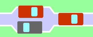 「へび丸道路」の太い部分は、すれ違うための待避場所です。この図は幅6mの道路をイメージしたもので、標準部分の歩行者の通行帯は両側2mずつで、車線はたったの2mのみです。もちろん「ガードレール」はありませんから、多少はみだしても問題ありません。歩行者にさえ気をつければ良いのです。そして、対向車が来たらここで行き交う事になります。