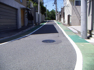 どんどん普及して欲しいのですが、なぜかこのスクールゾーンは、一方通行に限られているのです。緑のマーキングは段差などありませんから、自動車が行き違うときはちょっと緑の部分を踏んでやり過ごせば良いはずです。