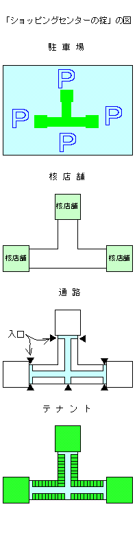 核店舗はたいてい2店舗以上配置されます。その理由は、専門店街の両端を核店舗でおさえておかないと、人の流れが偏ってしまうのです。もし、右の図で一番右の核店舗が無くなったとしましょう。おそらく、右半分の専門店街の人通りは極端に少なくなります。脇役に徹するも重要な役回りの核店舗と専門店街の共存共栄といったところでしょう。